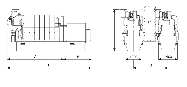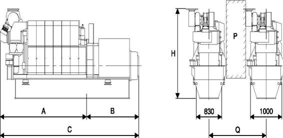 P:機組間的通道,寬600 mm,高2000 mm。Q:機組間的最短距離:1800 mm。 |